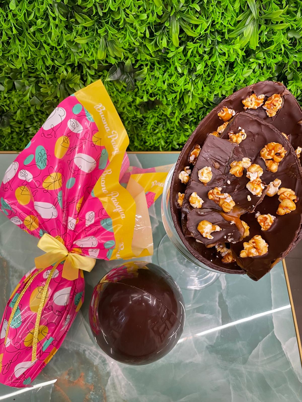 Un’esperienza di dolcezza e contrasto che ti sorprenderà! Il nostro Uovo di Pasqua al Cioccolato Fondente Ripieno con Caramello Salato e Pop Corn Caramellati unisce la ricchezza del cioccolato fondente con il sapore avvolgente del caramello salato e la croccantezza dei pop corn caramellati. Ogni morso è un mix perfetto di dolce e salato, per una Pasqua diversa dal solito. Perfetto per chi ama l’equilibrio tra il gusto intenso del fondente e la leggerezza dei pop corn!